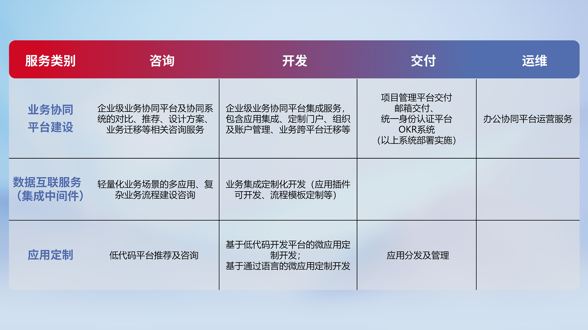 针对钉钉、、企微、、IDaas等平台级产品提供产品的规划、、、、方案、、交付、、定制化开发等服务,,,实现如统一协同办公、、、智能客户服务、、、、混合会议管理、、、、智能数据查询、、、等业务场景,,,实现数字化转型。。